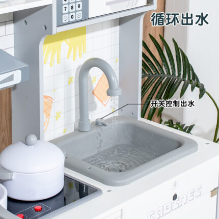The wooden play modern kitchen has a refrigerator , sink, stove & microwave. The play kitchen features interactive elements such as clicking stove knobs, a pretend play faucet & an ice maker that dispenses ice cubes. It's perfectly designed to encourage pretend play , creativity & development of social & problem-solving skills in children.