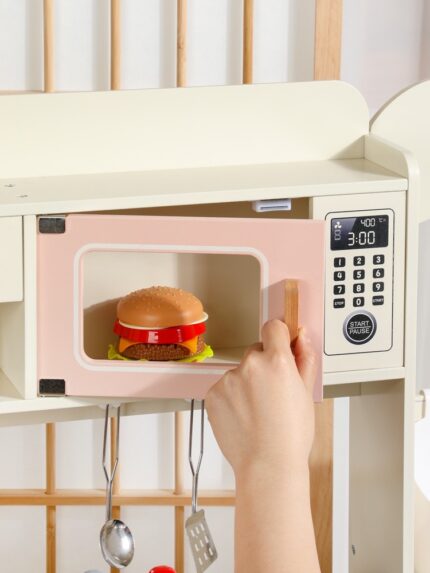 The pink wooden kitchen has several play areas including a sink, a worktop, a stove , a microwave , laundry , bread maker and microwave. The delicate finishing and gold lining makes it ther perfect gift for your little chef.