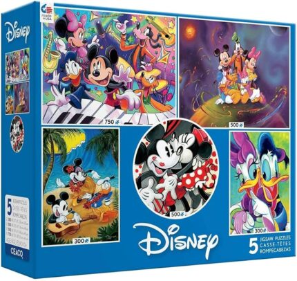 This item is a Ceaco Disney Classics 5-in-1 Multipack Jigsaw Puzzle Set featuring Mickey Mouse, Minnie Mouse, Donald Duck, Daisy Duck, Goofy, and Pluto.