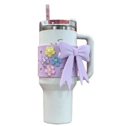 Accessorize your Stanley cup with the coolest ribbon like strap with flowers & teddy bears . Add the charms . Available colors : Pink with flowers, Fucshia with flowers & Purple with teddy bears. You get a random color
