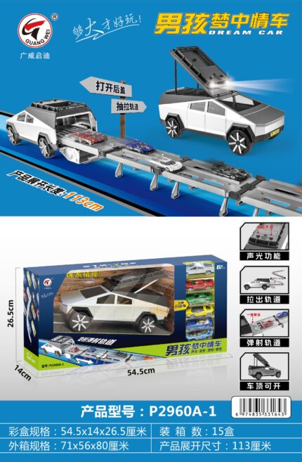 The launching track Cyber trcuk with 6 cars . The Cybertruck is in light green color.