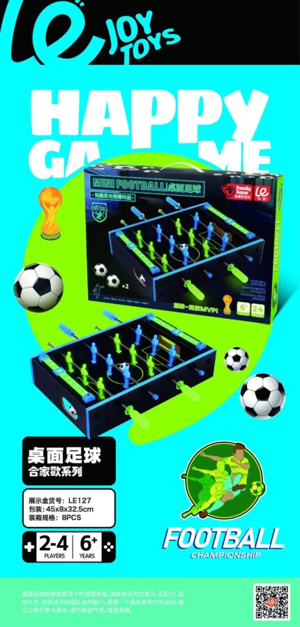 The wooden baby foot has a black base with blue and green neon colored players and handles. It includes two teams of 6 players, 2 balls & score counters. Suitable for 2-4 Players & recommended for the age 5-6 Years.