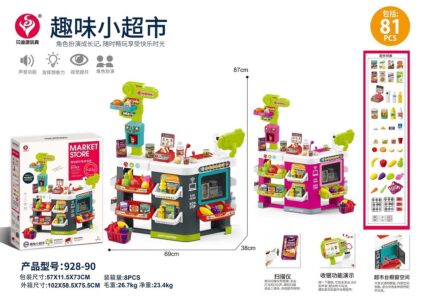 A role play suerpmarket set with 81 pieces . Available in Pink & Green Colors. The set includes a cash drawer, scanner & various play food items. The supermarket encourages imaginative play & helps children develop cognitive skills.