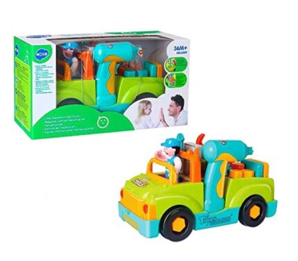The toy is a truck that can be taken apart & reassembled with the included tools. It comes with an electric drill , various tools, lights & music. The truck has a "bump-and-go" action , meaning it changes direction when it hits an obstacle. The toy is suitable for age 3+. It is designed to help develop fine motor skills, hand-eye coordination & problem solding abilities.