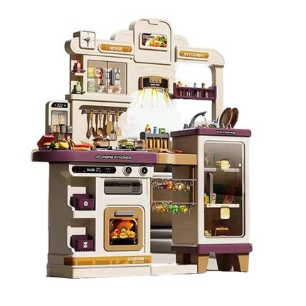 The wooden play modern kitchen has a refrigerator , sink, stove & microwave. The play kitchen features interactive elements such as clicking stove knobs, a pretend play faucet & an ice maker that dispenses ice cubes. It's perfectly designed to encourage pretend play , creativity & development of social & problem-solving skills in children.