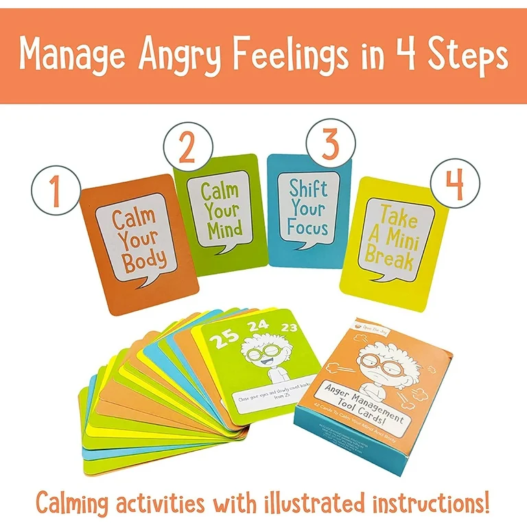 Open the Joy with the Anger Management Cards . Learn how to manage angry feelings allowing children to enhance social skills and develop emotional intelligence. With endlessillustrated activities to calm the body and mind : Take a mini break, Shift your Focus, Calm Your Mind & Calm Your Body .