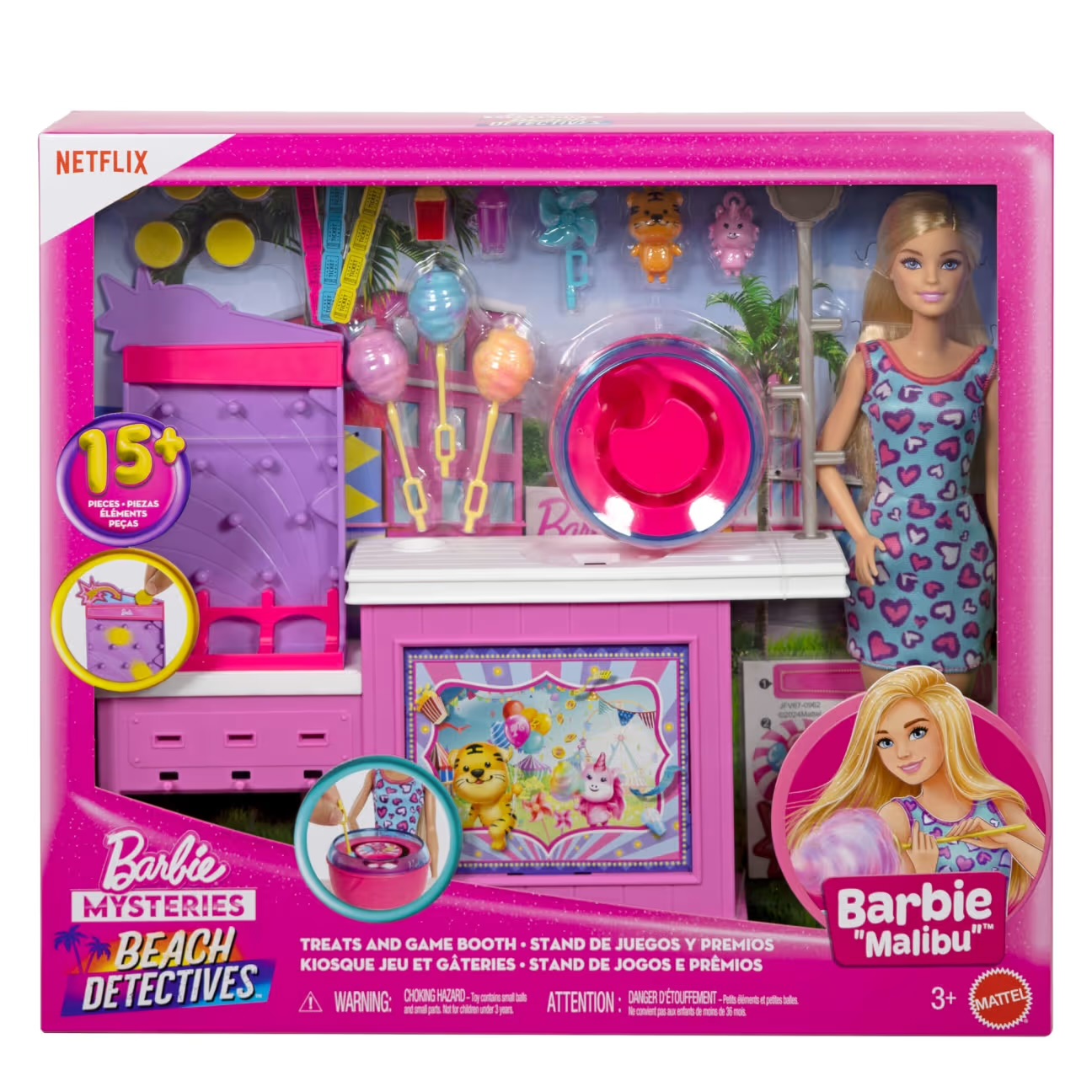 Imaginations can create all kinds of beachside stories with this Barbie Mysteries: Beach Detectives doll and game booth playset!