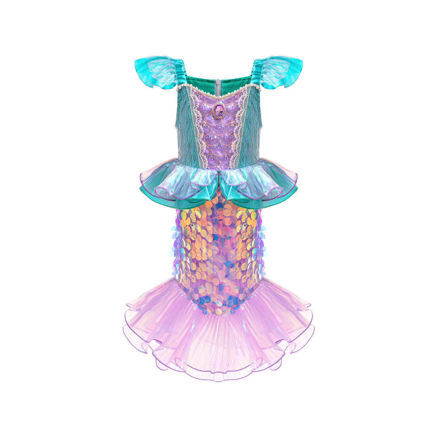 The dress has a turquoise bodice, flutter sleeves, a purple & blue peplu, around the waist & a skirt covered in iridescent , multi colored squins that transtion to a ruffled, translucent puple & green hem to form the “tail”. available sizes 110-120-130