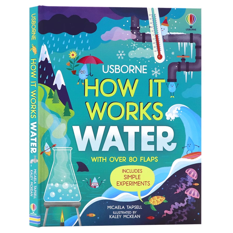 The book explores the science of water with over 80 flaps to lift & includes simple experiments. It delves into how water changes states, the water cycle, how water shapes landscapes & the impact of too much or roo little water.