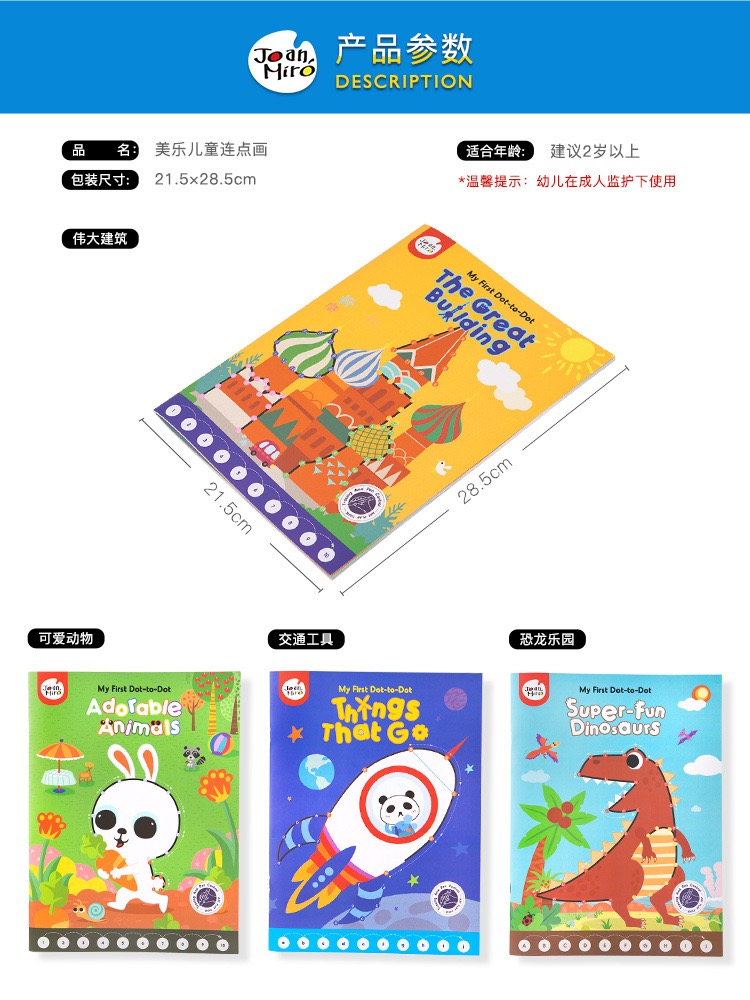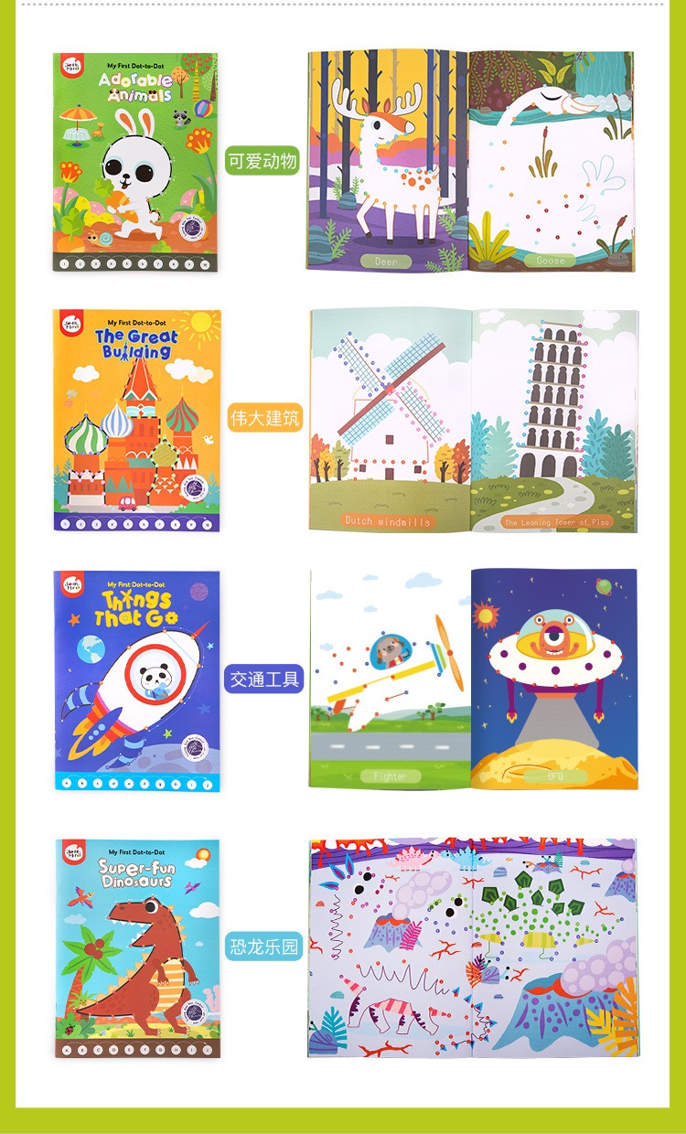 Point-to-point connection painting, so that your child find the fun of painting . Rich patterns make sure your kids will love. Paperback: 18 pages. Available themes: dino, great building, things that go & adorable animals.