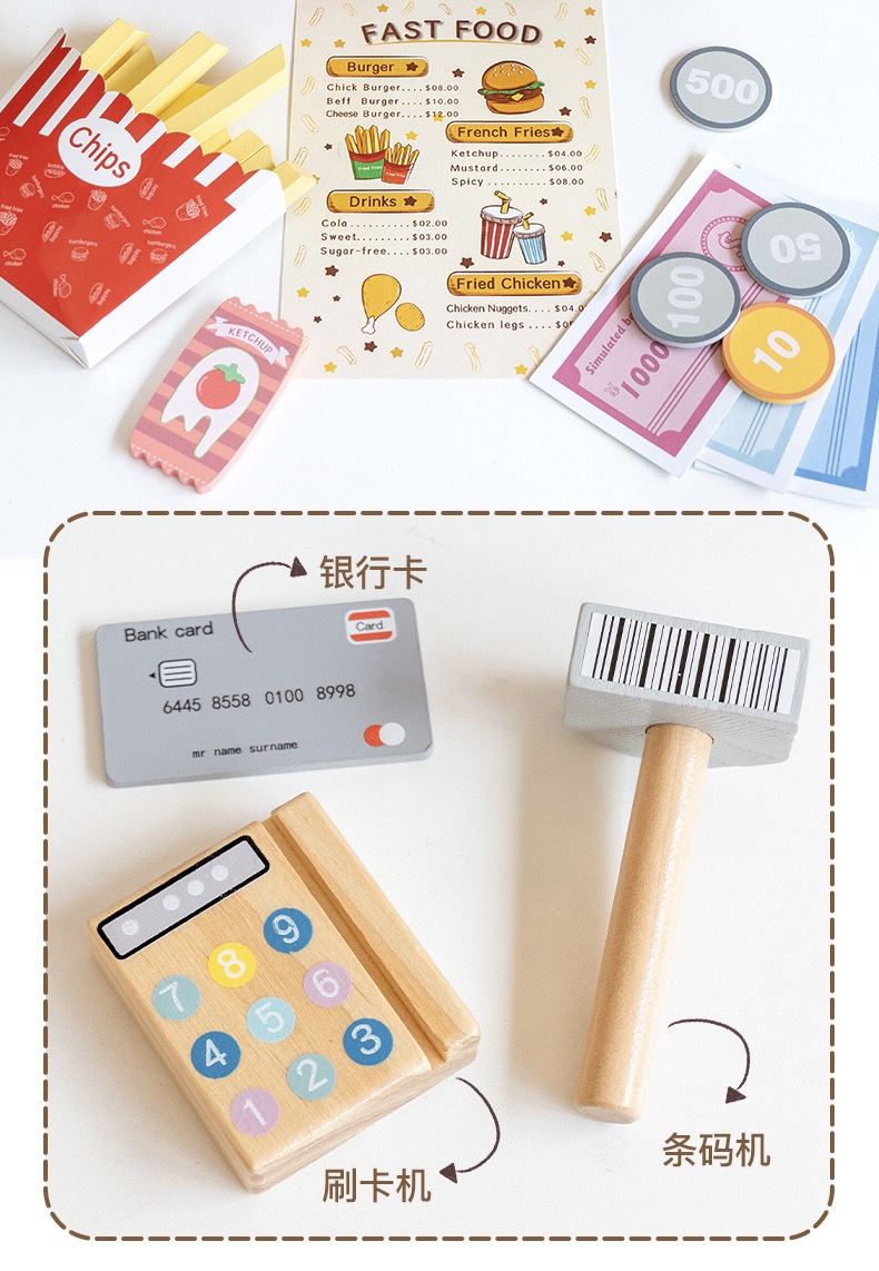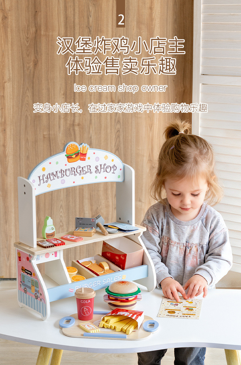 The wooden hamburger shop toy set is made from smooth wood. It includes various accessories such as burger components , french fries, drinks, ketchup and toy money. Designed for role-playing to help improve social skills and parent-child communication. Suitable age 2-7 Years.