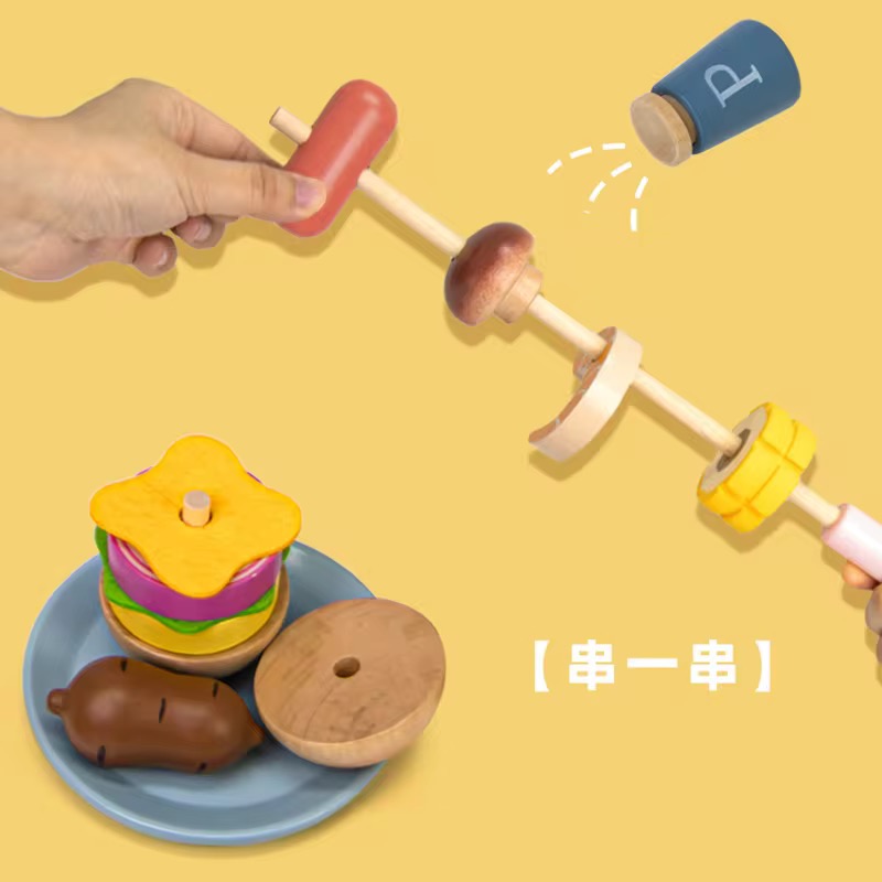The wooden barbecue set encourages imaginative play & help develop social & fine motor skills. The set includes various acessories like toy food items ( burger , fries, fish , skewers with vegetables), seasoning bottles & grilling tools such as a knife, spatula .