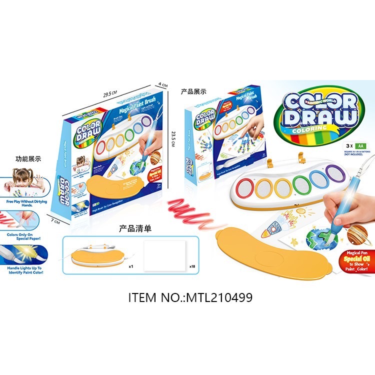 The color draw magical paint brush ! The brush lights up to indicate the selected color & colors only appear on special color wonder paper , preventing messes. It includes the magic light brush uni , a palette with multiple colors & 18 sheets of color wonder paper sheets.