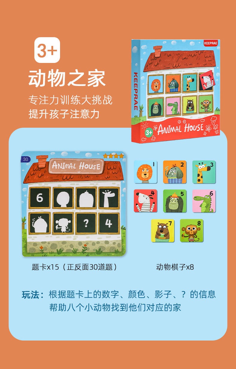 The magnetic puzzle game designed to train concentration and logical thinking for children age 3+. The puzzle board shows a house with numbers slots and some slots are empty or have a question mark. The goal is to place the right animals tile in the emplty slot. Match the number : each animal has a number on it . Determine the sequence : the numbers on the board seem to follow a sequence .