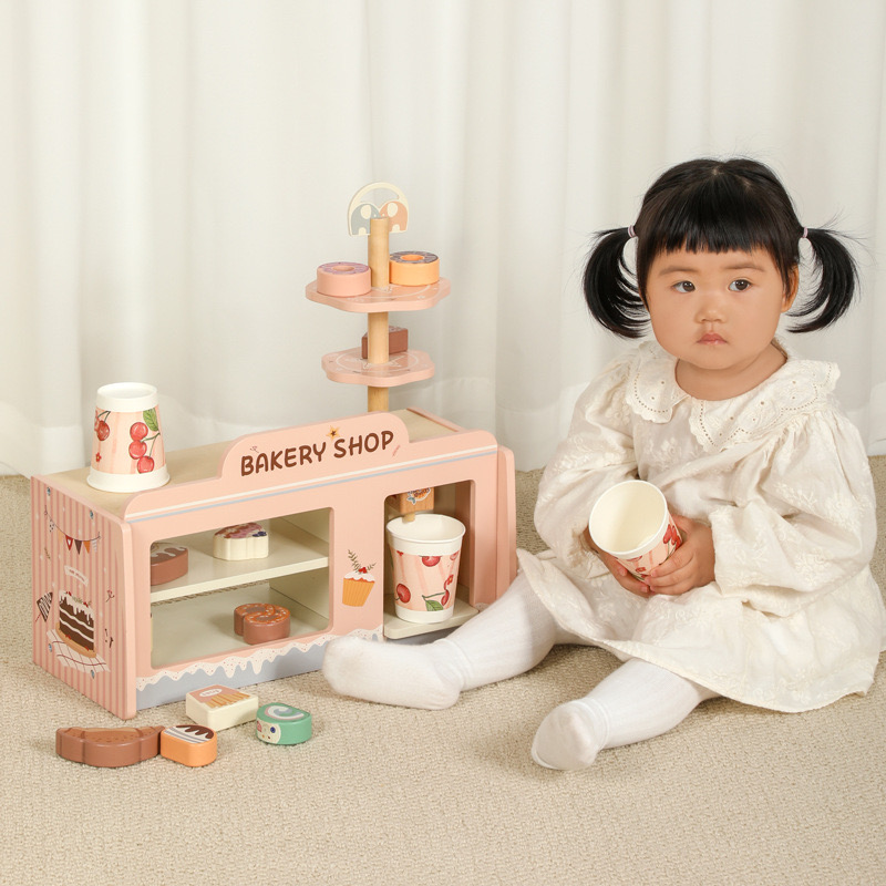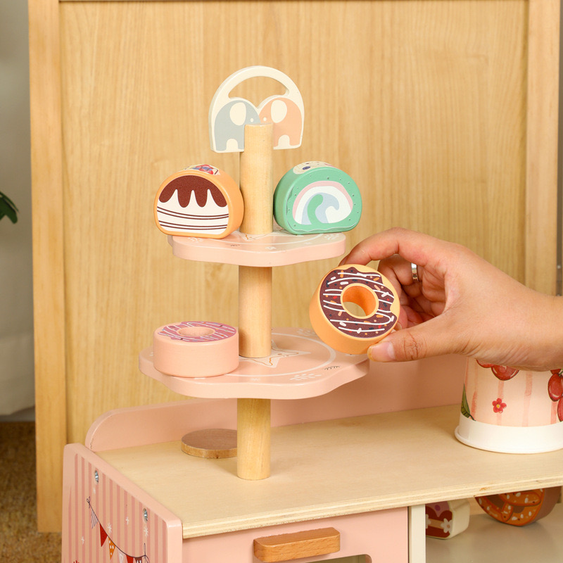 A pretend play kitchen accessory set for children that encourages creativity and imagniative role-play. The set includes miniature baked goods like doughnuts, cakes and cupcakes along with a counter, display shelves, cups & an oven. Suitable for the age 3+.