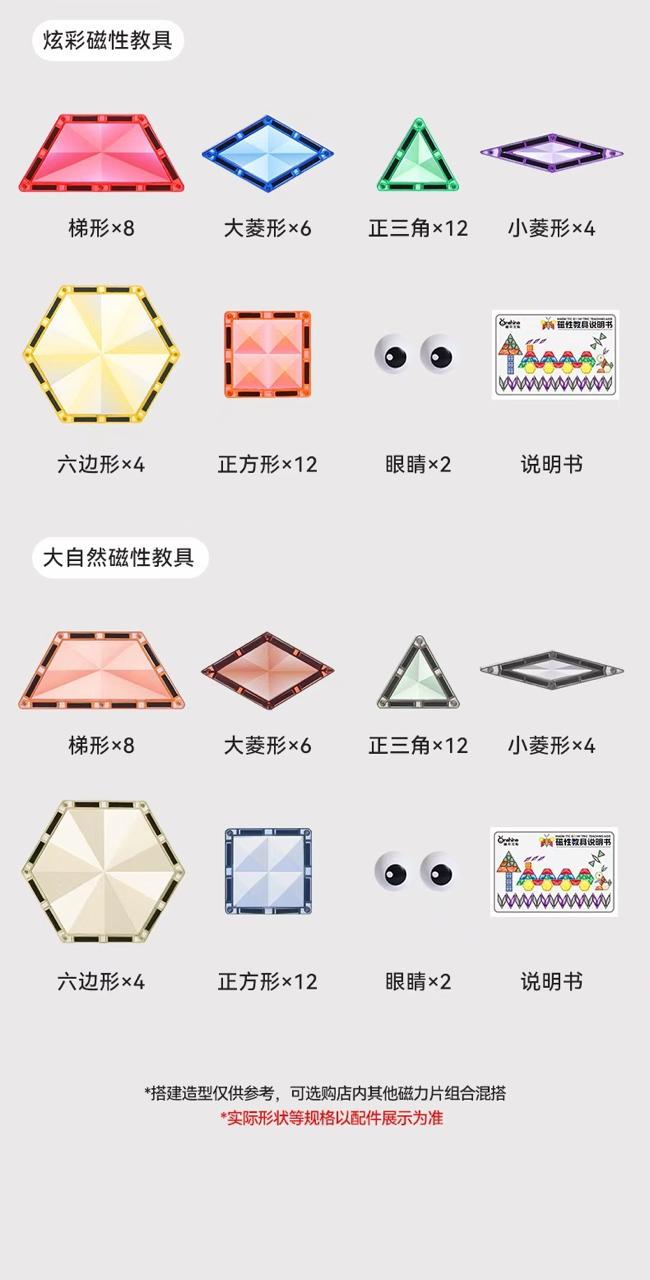 Set Contents: Includes 48 pieces total: 12 squares, 12 equilateral triangles, 8 trapezoidal, 6 large rhombus, 4 small rhombus, 4 hexagon, 2 eyes, and an instruction manual. Packaging Size: The box measures (36times 5.5times 27) cm. Material: The tiles are made from safe and durable Food-grade ABS material. Educational Focus: These tiles are designed to help children develop math, science, spatial, and tactile skills. Age Recommendation: Suitable for children ages 3 and up.