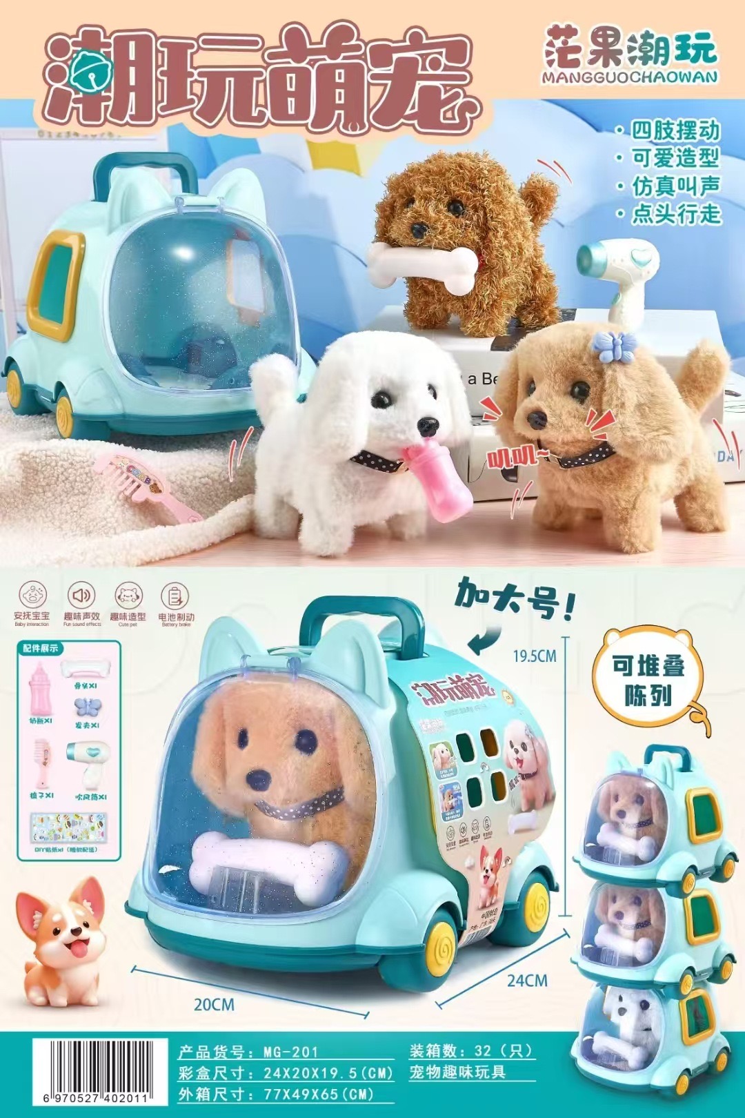 Carry along the pet with the mini carriage . The pet is battery operated & makes sounds. Available in Cat & Dog.