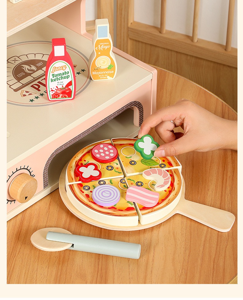 The latest additon of One Elephant . This wooden pretend play set is designed for children , featuring a pizza oven , pizza slices with customizable toppings , ketchup, a pizza paddle & other accessories. It is designed to enhance social skills , creativity and fine motor skills through imaginative play.