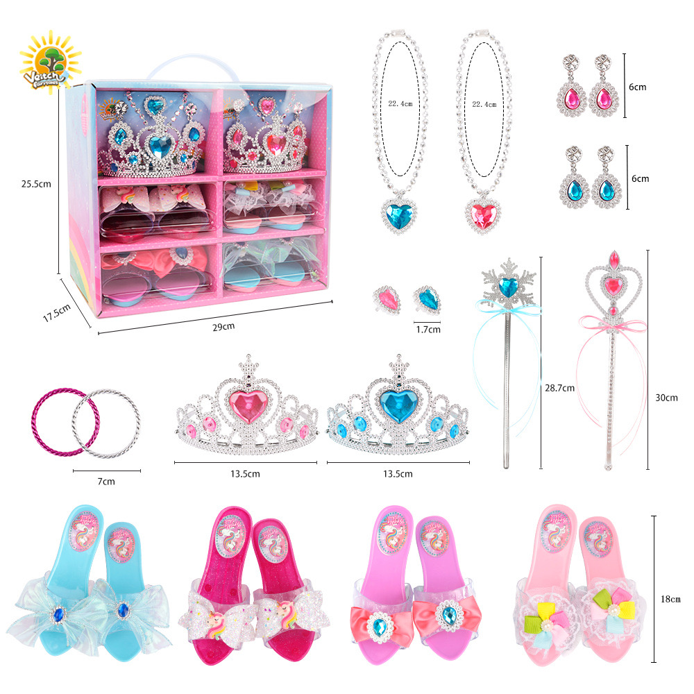 The princess accessory set comes with everything your child needs to complete any dress up outfit, including 4 pairs of shoes in pink, blue, gold and silver, 3 bracelets, 3 rings, and 2 pairs of earrings. The princess play set encourages creativity and imagination and is fantastic for pretend play activities. It’s a wonderful addition to any dress up or make-believe wardrobe