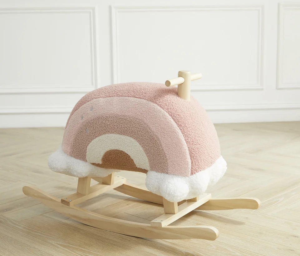 The Kid Powered Rocker is a perfect companion for any toddler’s nursery or playroom. It’s AMAZING , ADVENTUROUS & WHIMSICAL. Features : a plush ride on toy that is in style available in Rainbow or Peacock designs. Wood Handles to hop on and hand on. Swipe for details.
