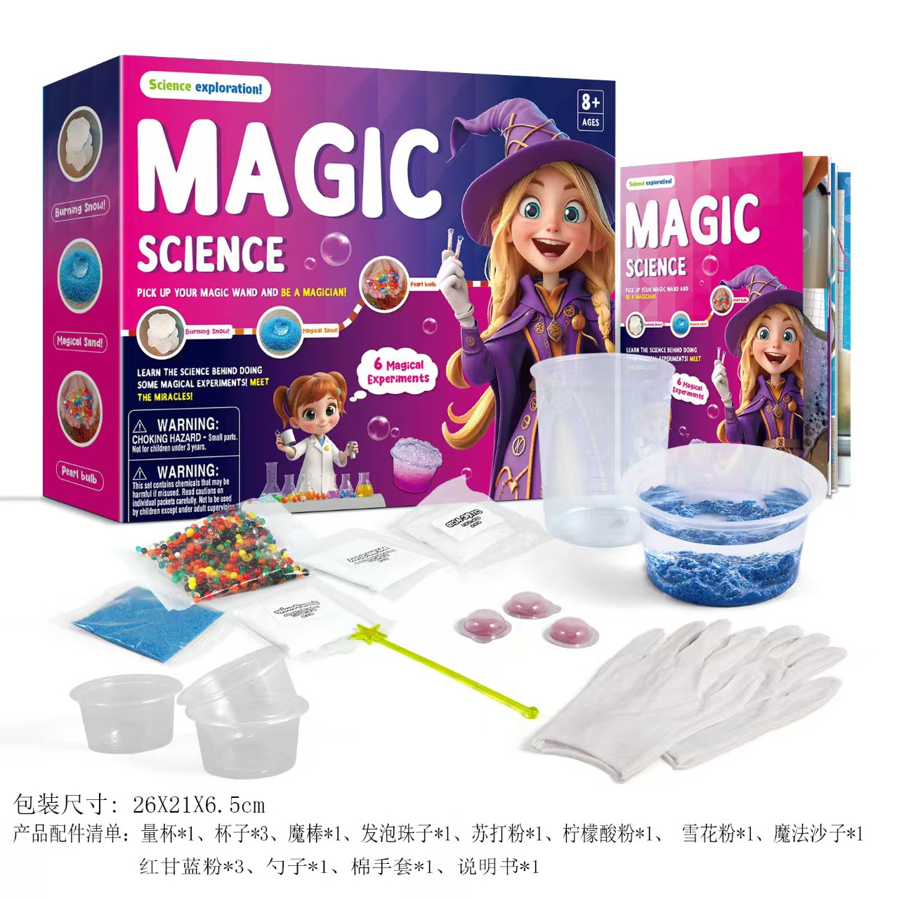 The Kit includes 3 red cabbage power, 1 magic sand , 1 snow powder, 3 clear cups , 1 guide book, 1 baking soda power , 1 measuring cup , 1 magic wand , 1 spoon , 1 dropper 1 water beads & 1 pair of cotton gloves.