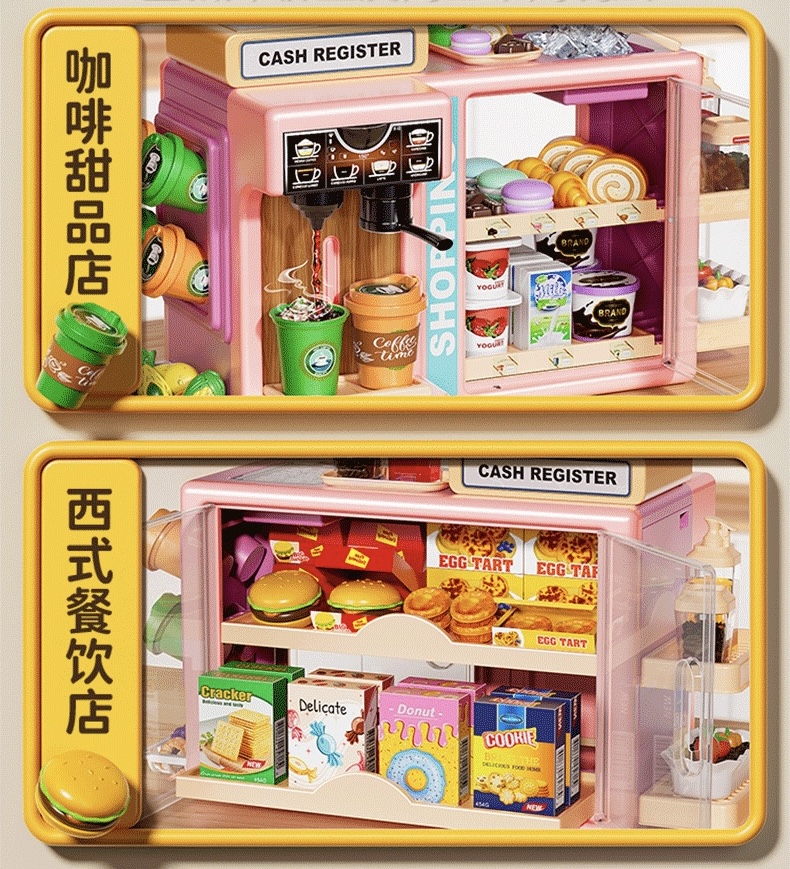 The Dream Supermarket cash register & coffee machine playset is an educational interactive role-play set that helps improve children’s hands-on abilities and imagination. Features include a simulated touch screen , sound & light effects, a scanner & the ability for the coffee machine to dispense water. Suitable age 3+.