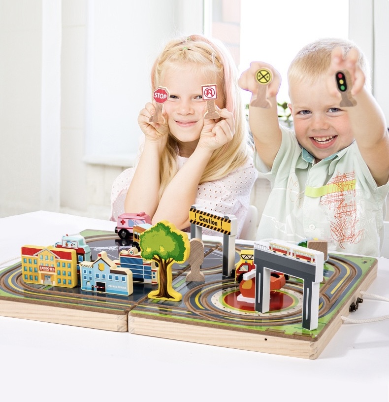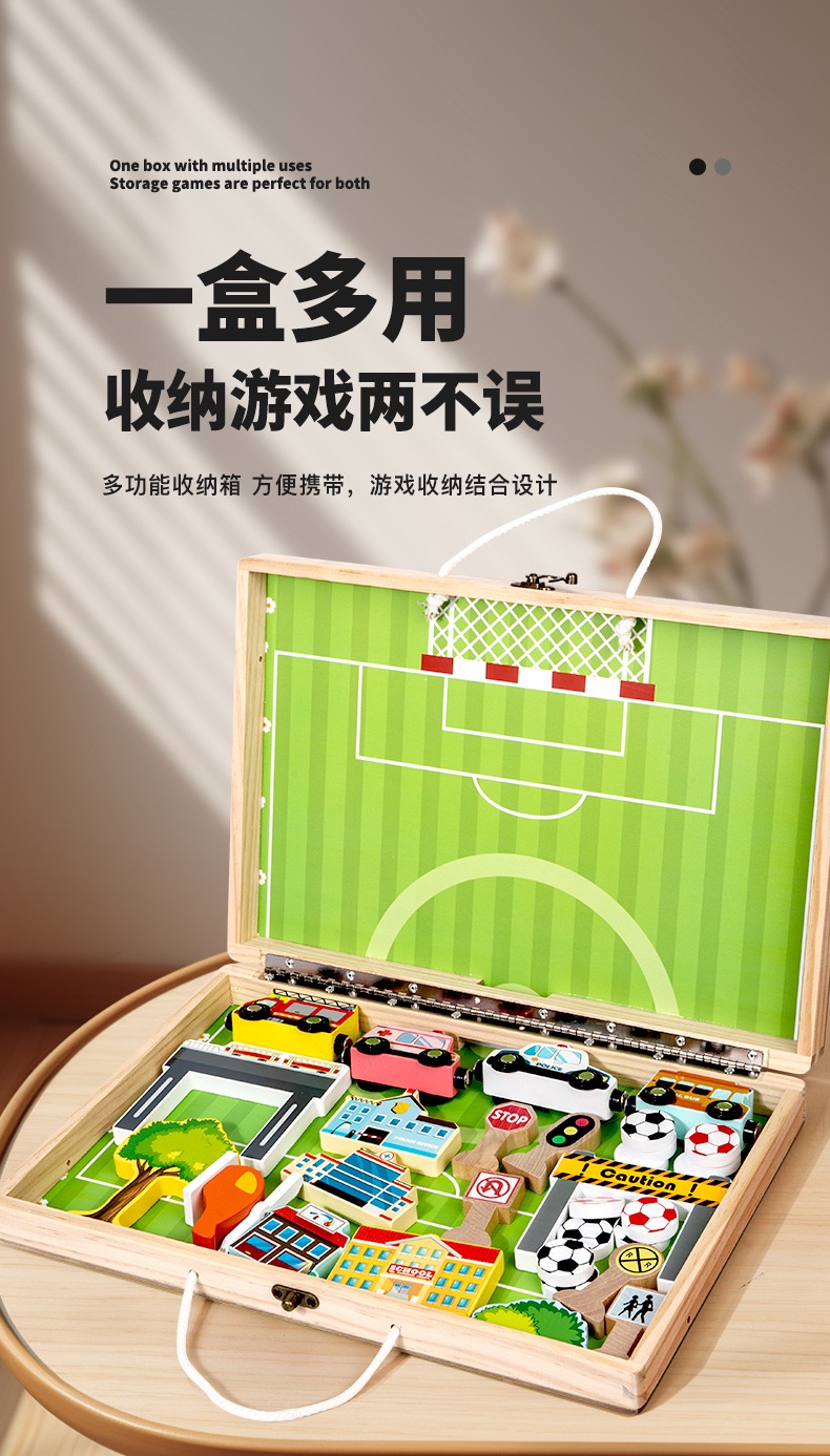 The Urban wooden rail & football chess game is here. The wooden magnetic vehicles , the train & wooden football shapes pegs are perfect for a multi-game. Suitable for the age 3-5 Years. Store the cars back again & save some space after playing.