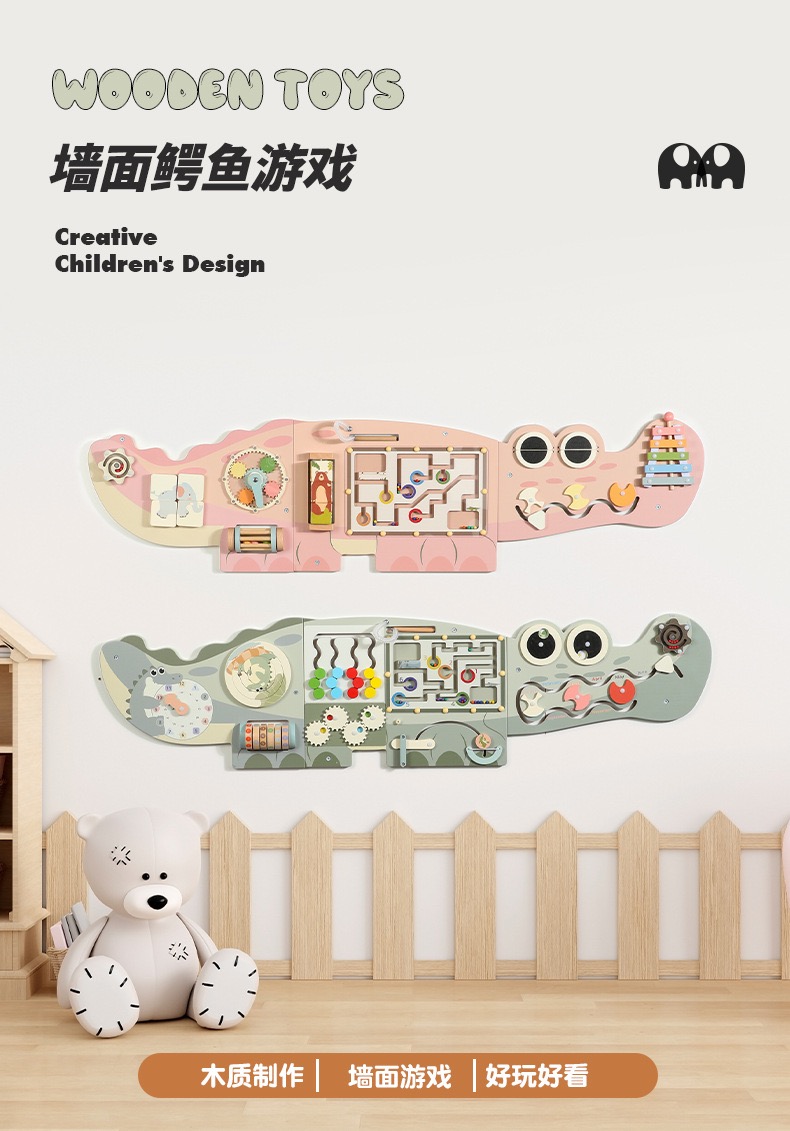 The wooden Montessori busy board crocodile is perfect for toddlers to enhance their fine and gross motor skills. Move through various stations and explore their skills. Available in 2 colors : Pink & Green . The games might vary per color.
