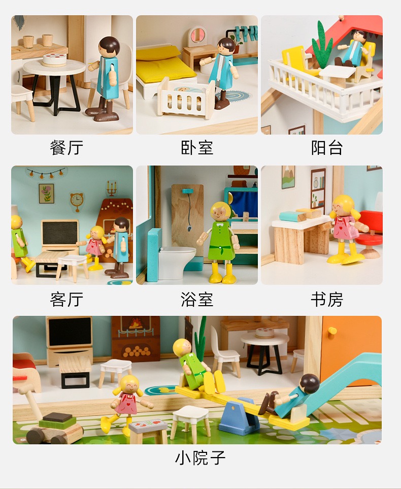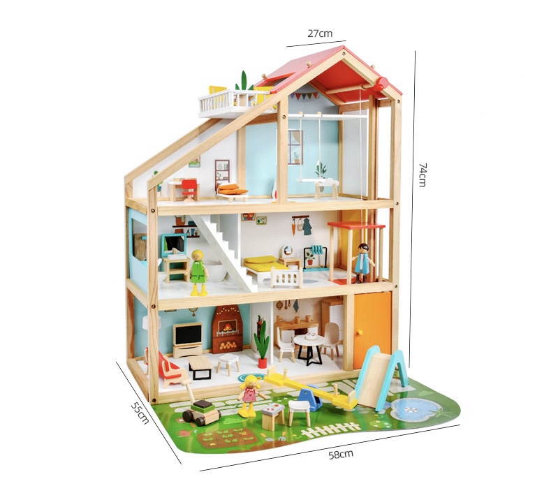 The multi-story wooden doll house is designed for imaginative play. Features multiple rooms such as bathroom, bedroom, living room and kitchen with detailed wallpapersto mmic real-life scenes. It helps children practice linguistic and emotional development. Made from solid wood.