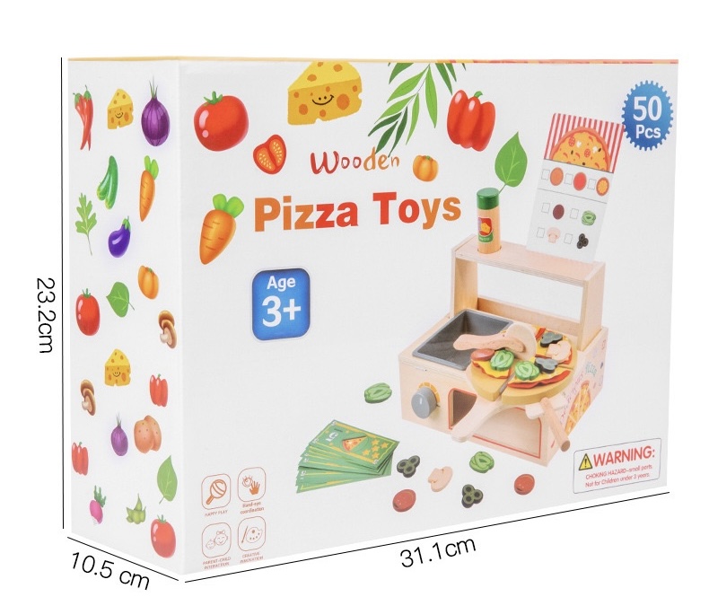 Designed to stimulate imaginative play & develop fine motor skills. It typically includes a wooden pizza oven, pizza slives , various toppings like pepperoni , mushrooms & peppers, a serving board , pizza cutter & a server. The set encourages role playing as a pizza chef , enhancing creativity and hand-eye coordination.
